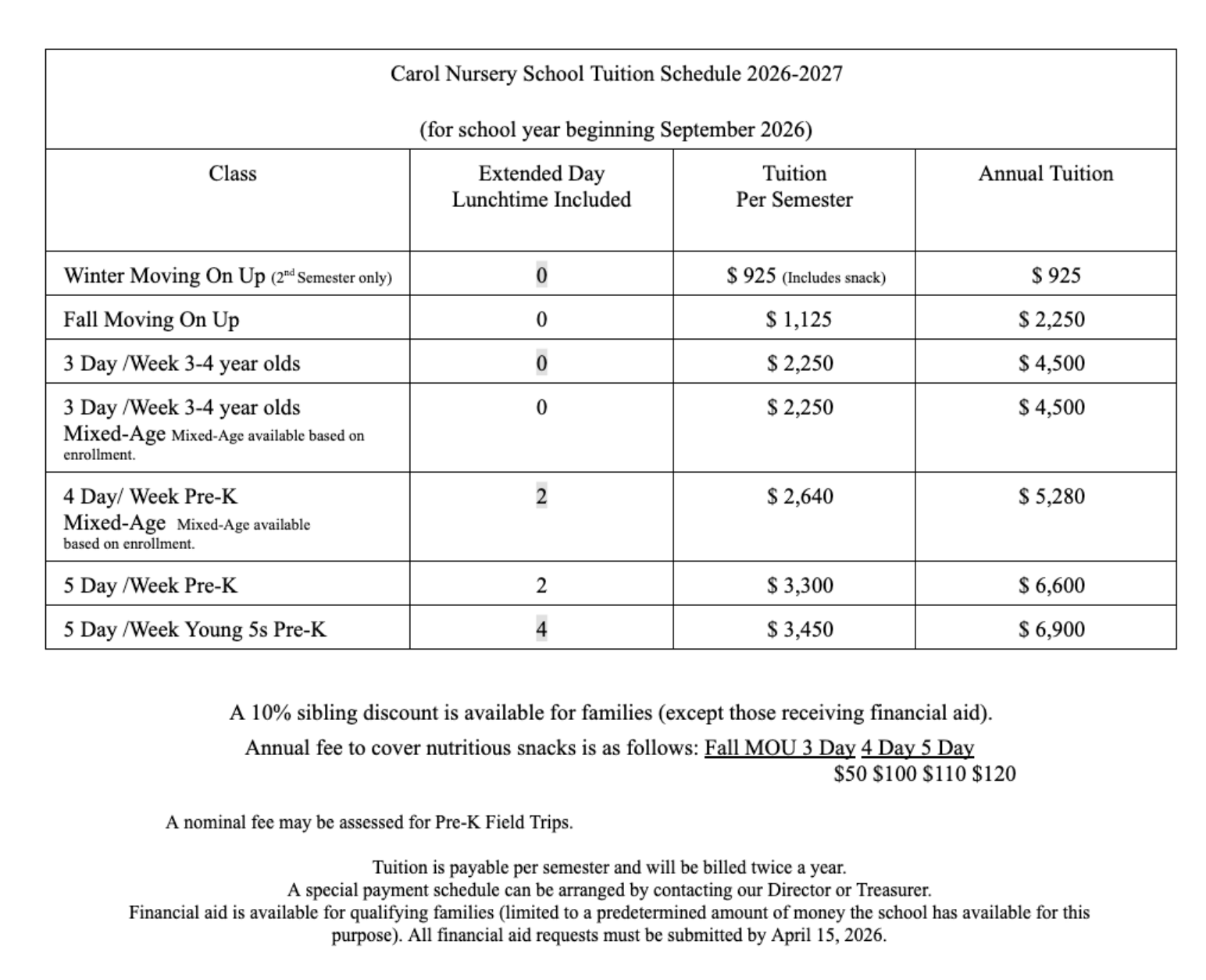 Tuition is payable per semester and will be billed twice a year. A payment plan can be arranged by contacting our Director or Treasurer. Financial aid is available for qualifying families (limited to a predetermined amount of money the school has available this purpose). All financial aid requests must be submitted by April 15.